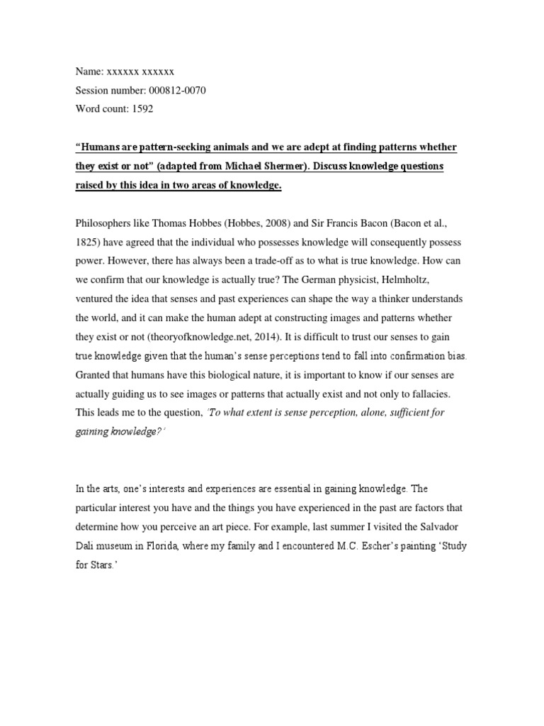 A clear understanding of the meanings of these major words in Theory of Knowledge course is vital in the development of a good ToK essay. Each way of Knowing or Area of Knowledge is a section in the structure of your essay composed of paragraphs.